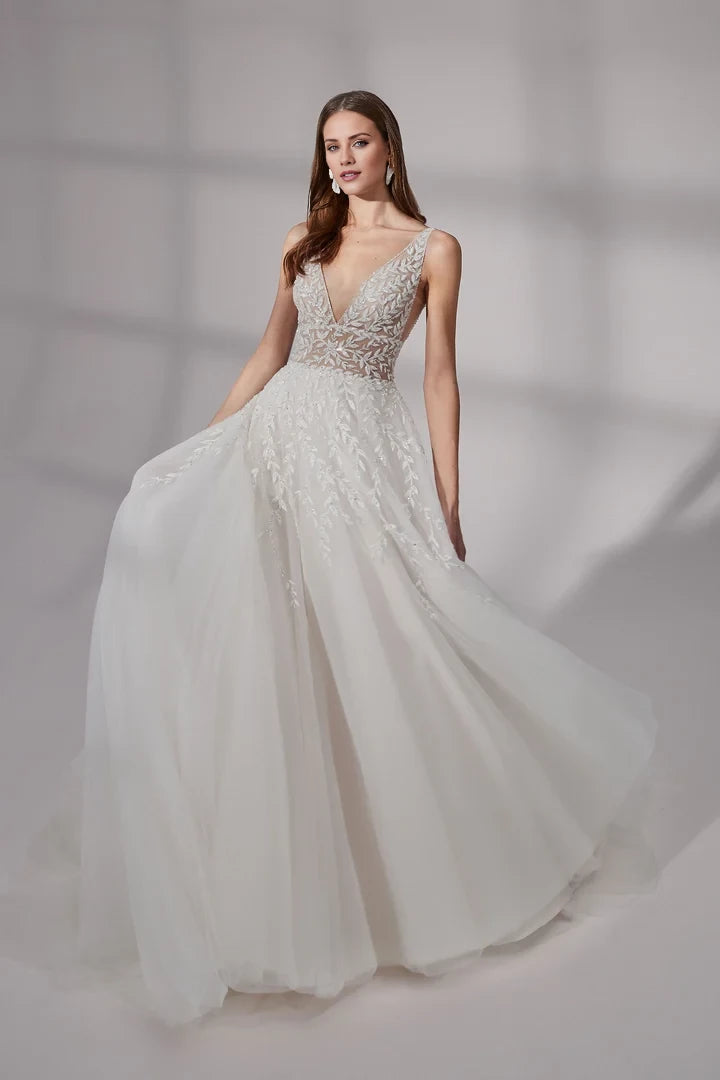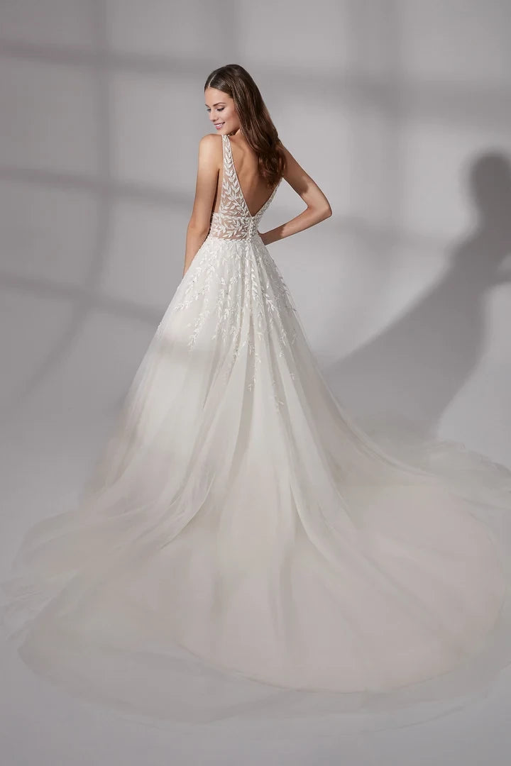 This wedding dress features a deep V-neckline paired with an illusion bodice, designed in a classic ball gown silhouette for an elegant bridal look.