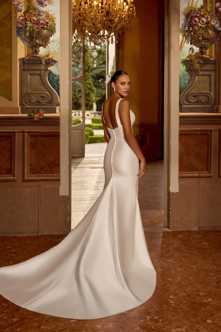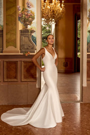 This wedding dress features a fit and flare silhouette complemented by a deep V-neckline, offering an elegant and flattering design for brides seeking a sophisticated look.