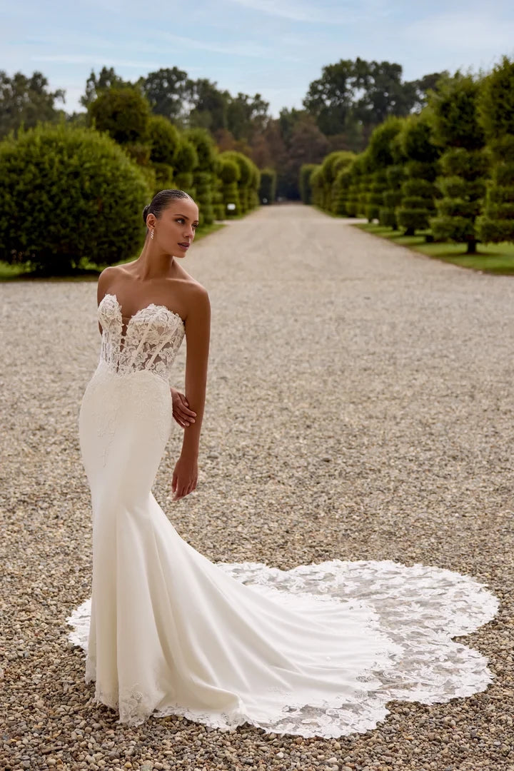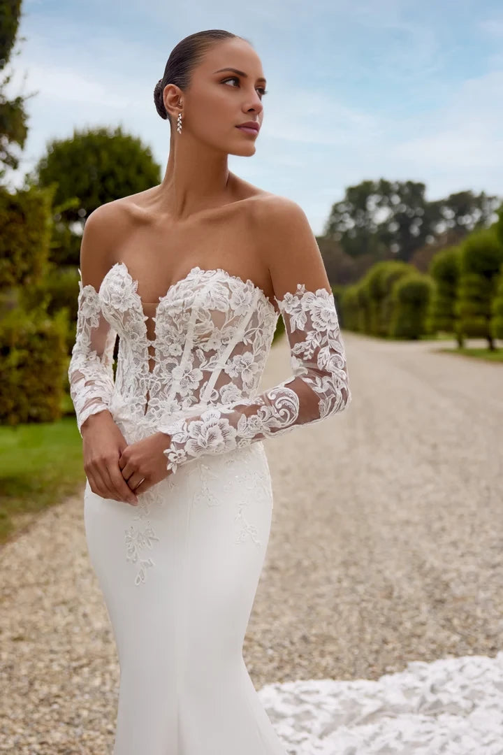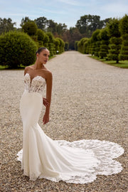 This wedding gown features a fit and flare silhouette, highlighted by exposed boning and a distinctive basque waist design.