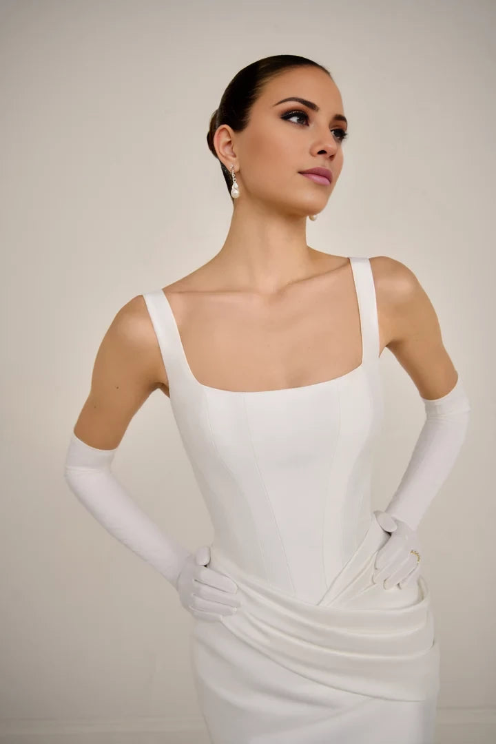 This wedding dress features a flare silhouette complemented by a basque waist and asymmetrical draping over the hip, creating an elegant and sophisticated look.