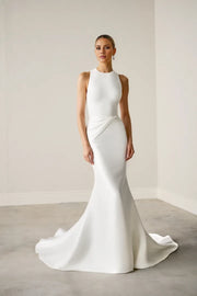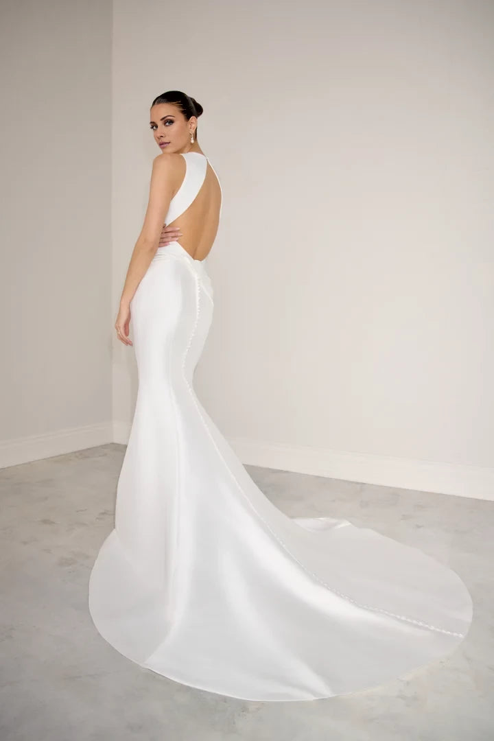 This wedding dress features a flare silhouette complemented by a high jewel neckline and an elegant keyhole back, combining classic refinement with modern detail.