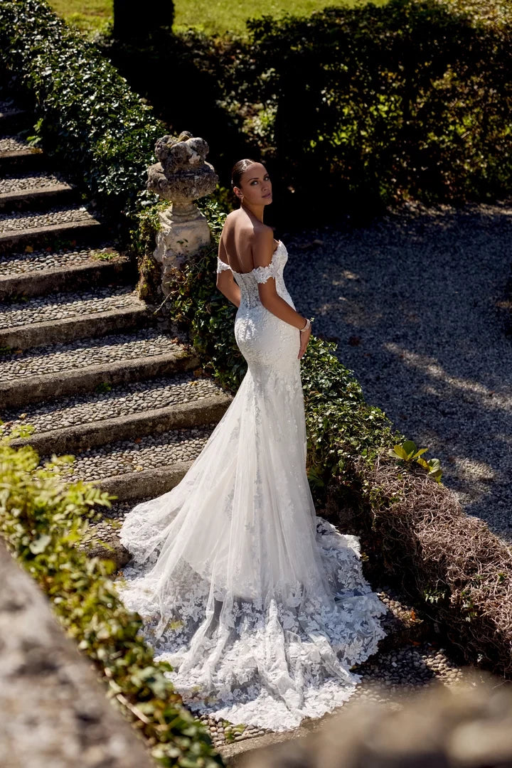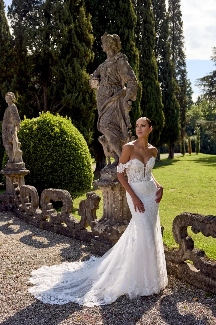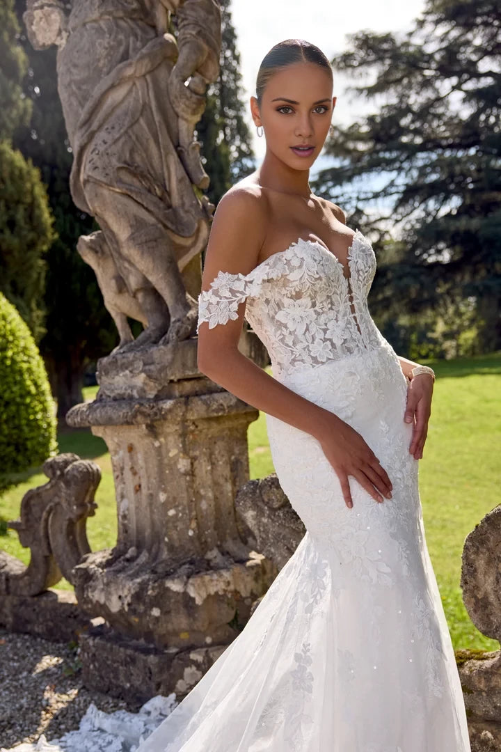 This wedding dress features a lace fit-and-flare silhouette with detachable off-the-shoulder straps, offering versatile elegance for your special day.