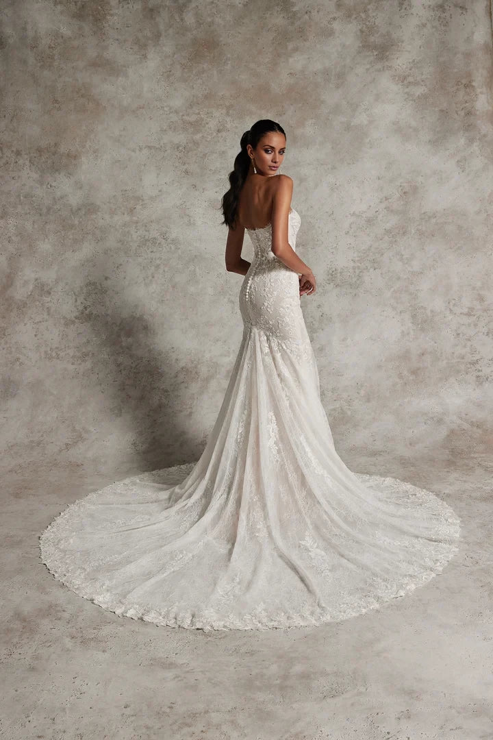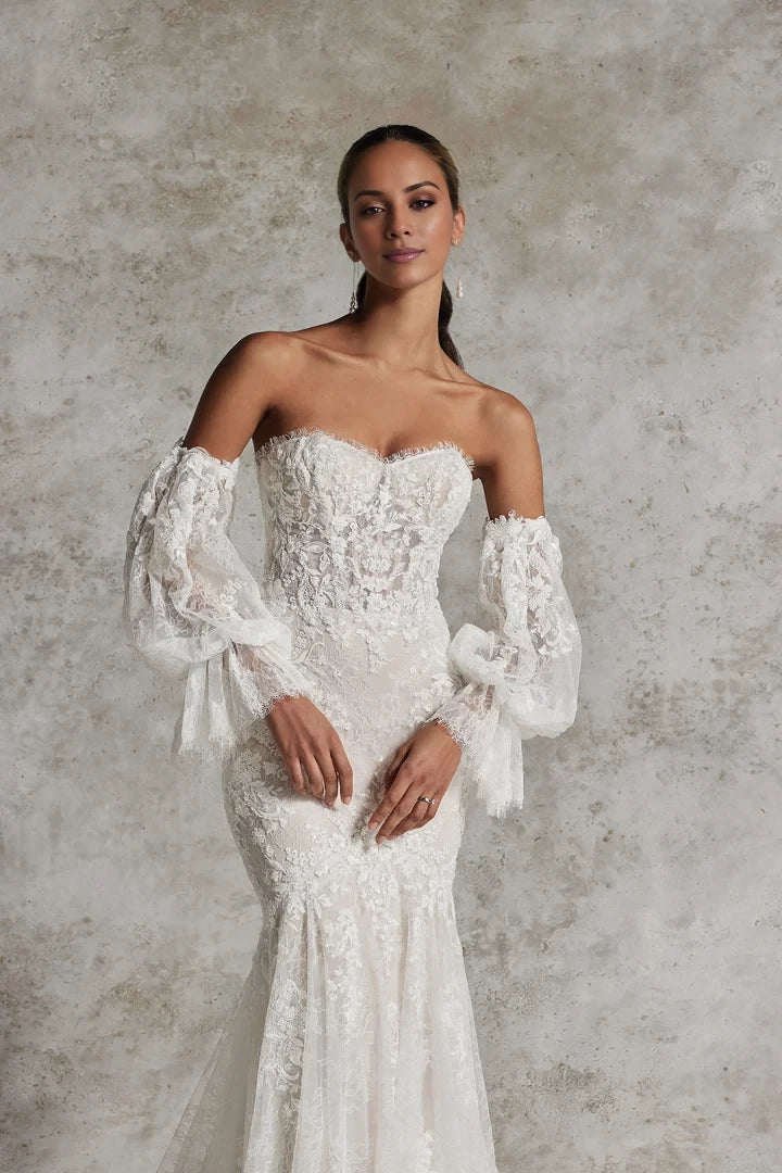 This wedding dress features a lace fit-and-flare silhouette complemented by a sheer bodice, combining elegance with a modern touch.
