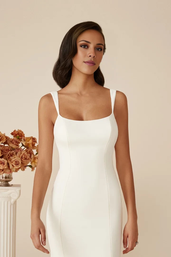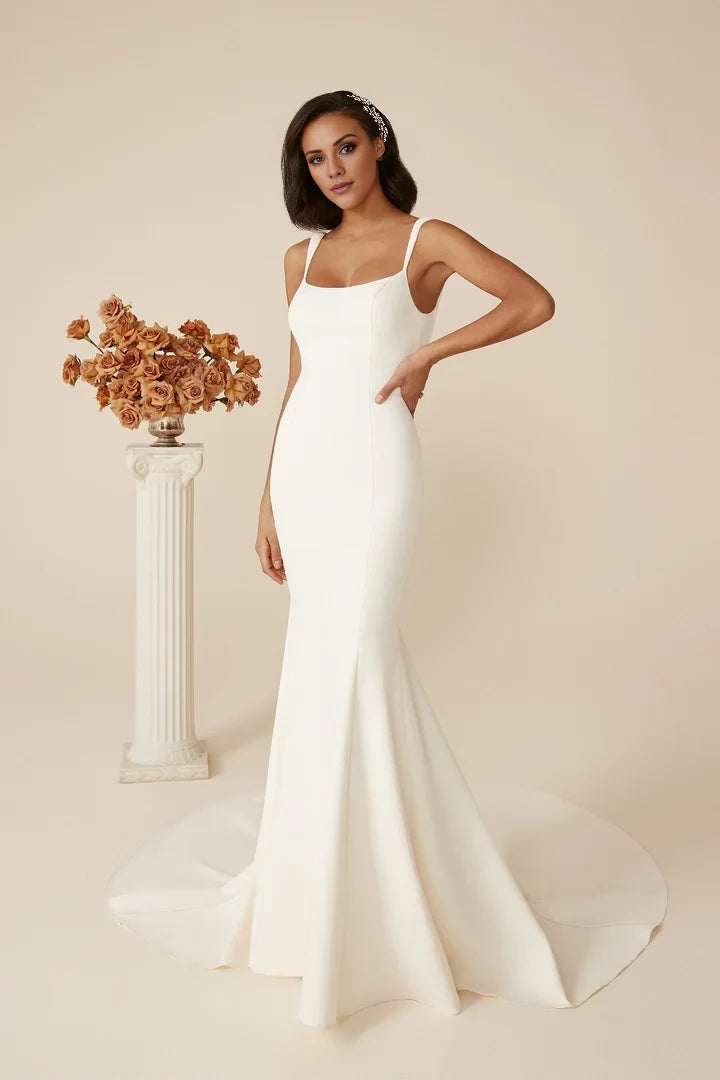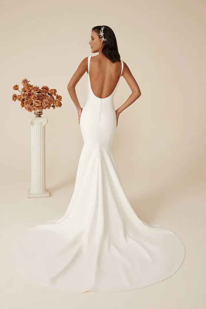 This wedding dress features a low back and backless design crafted from crepe fabric, offering a flattering fit-and-flare silhouette ideal for elegant occasions.