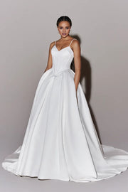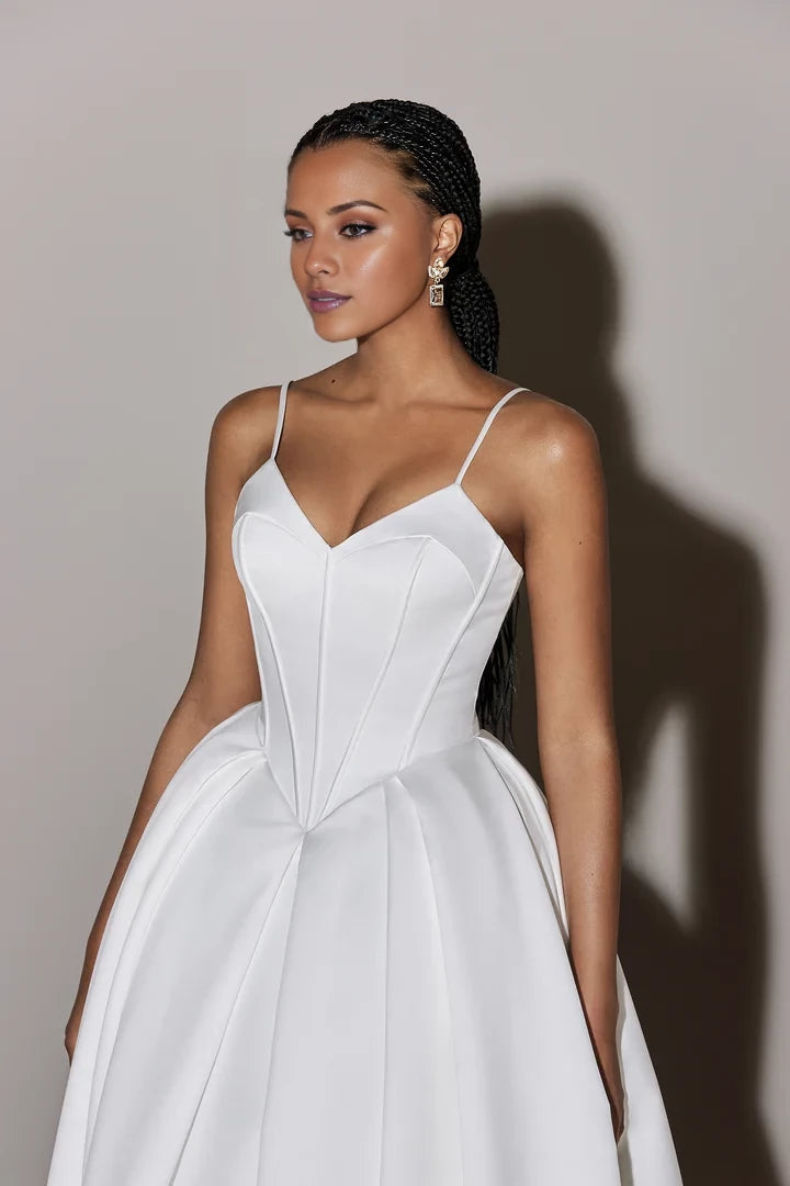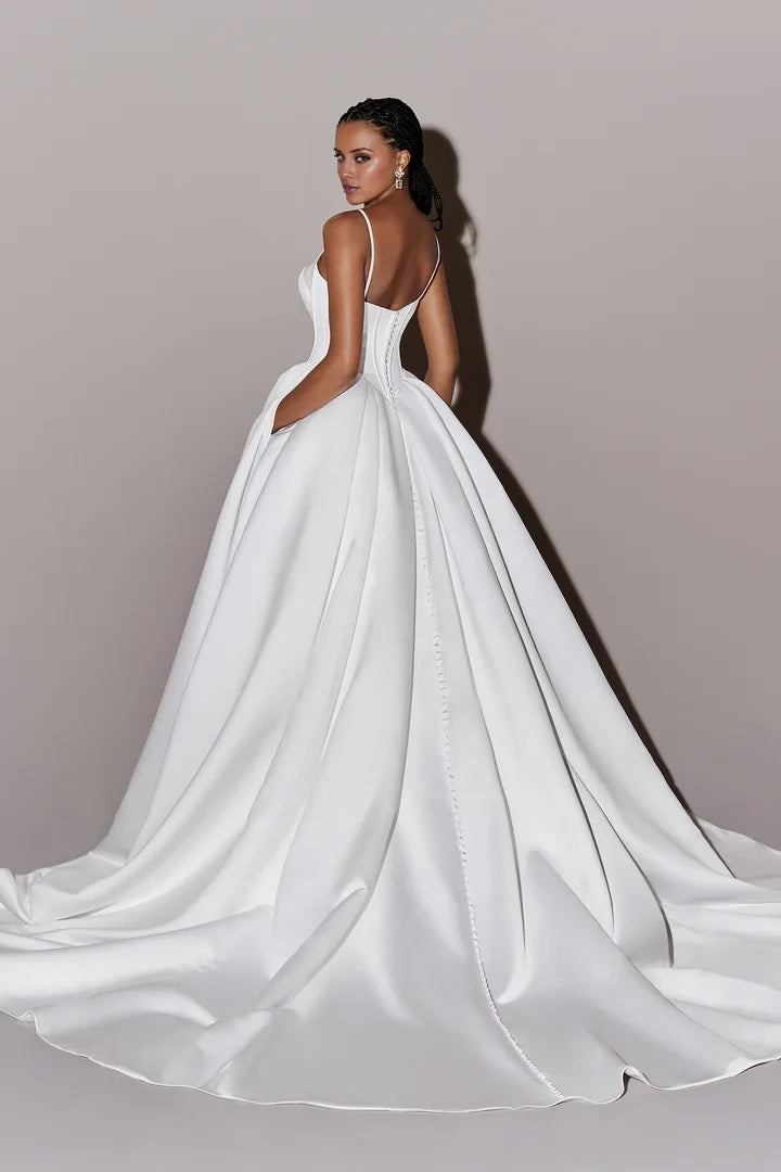 This elegant wedding dress features a luxurious satin ball gown silhouette complemented by a flattering basque waist, designed to enhance your figure with expert craftsmanship.