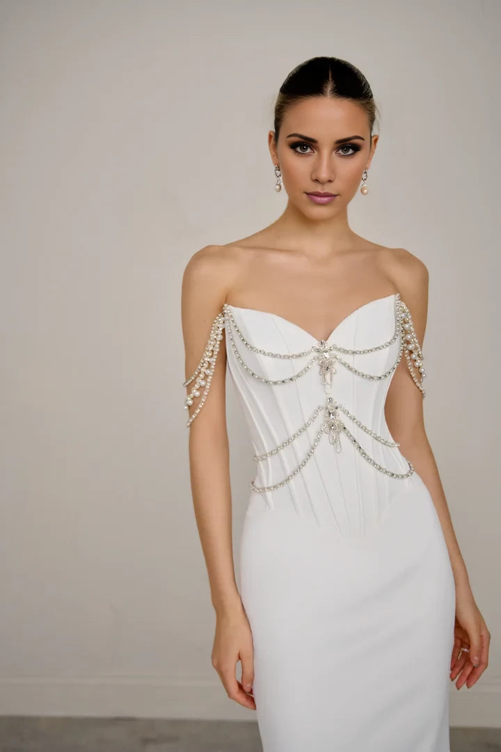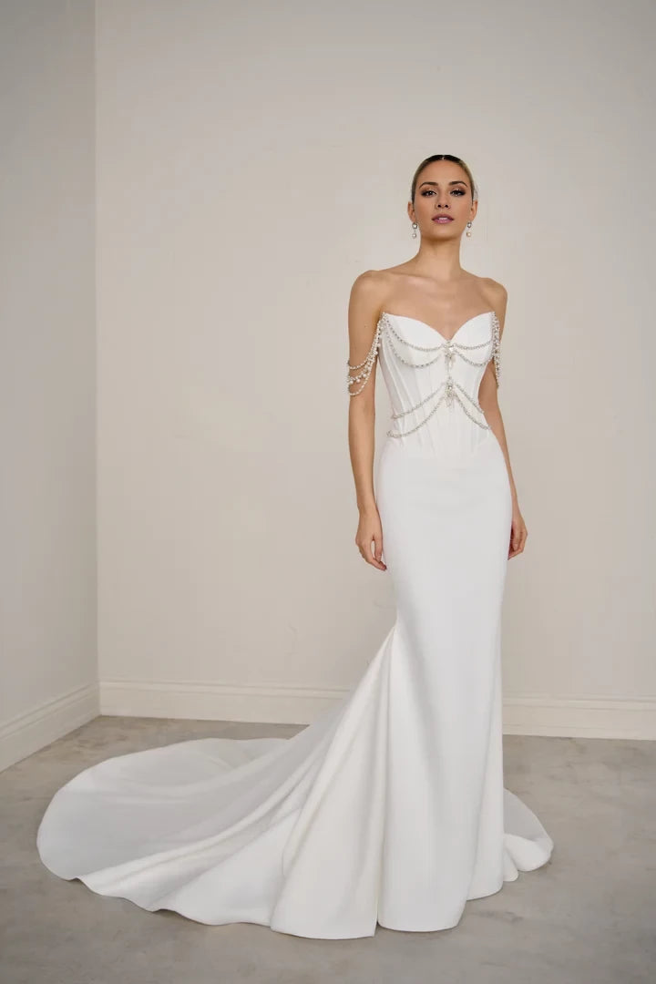This wedding dress features a matte satin fit-and-flare silhouette, enhanced by a draped beaded corset with boning for structured elegance.