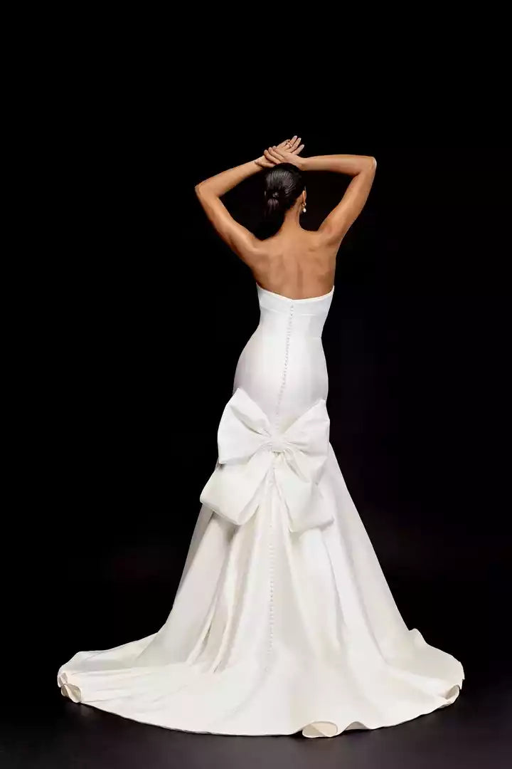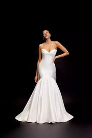This wedding dress features a Mikado trumpet silhouette paired with a uniquely designed sweetheart neckline, offering a sophisticated and elegant bridal look.