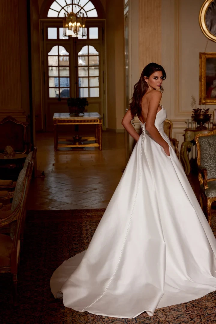 This contemporary A-line wedding dress features a strapless design with a distinctive notch neckline, combining modern elegance with timeless silhouette.