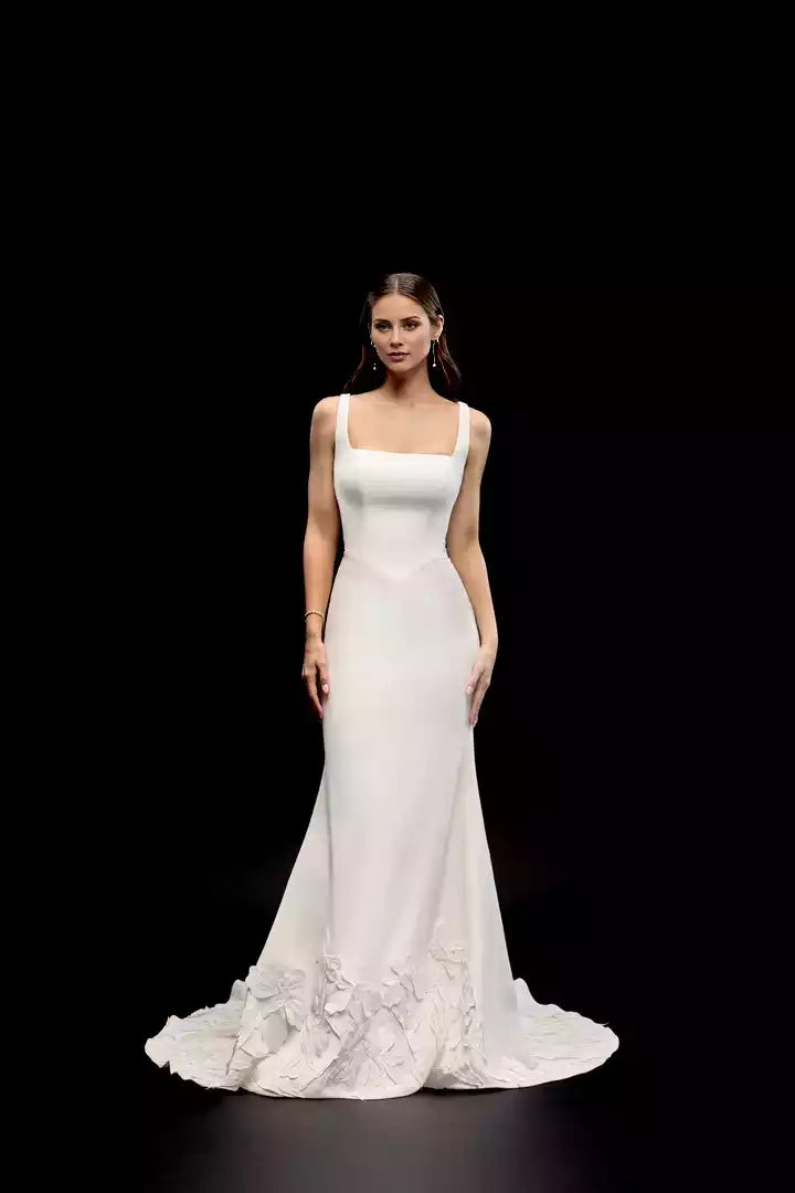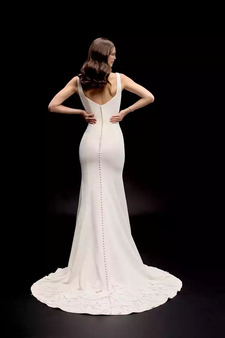 This contemporary wedding gown features a crepe fabric with a fit-and-flare silhouette, adorned with delicate appliqués for an elegant finish.