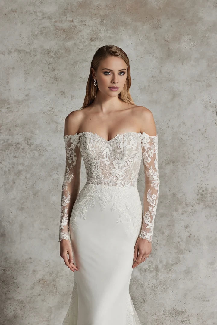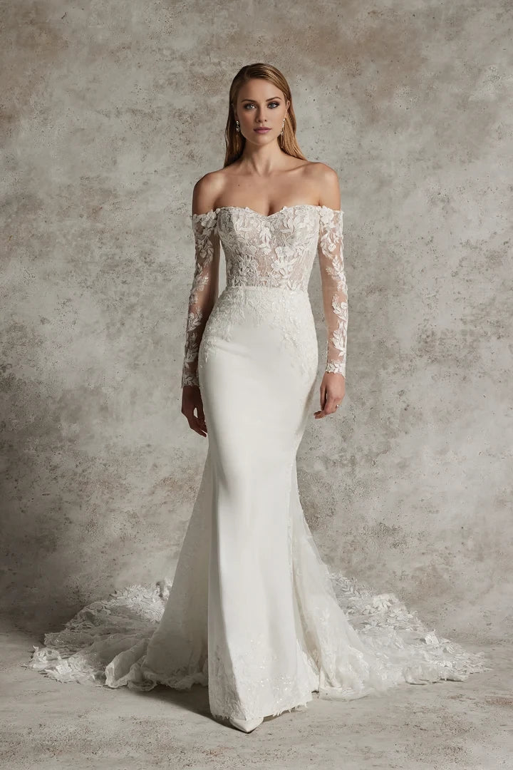 Off-the-Shoulder Fit and Flare Wedding Gown with Cathedral Train Wedding Dresses