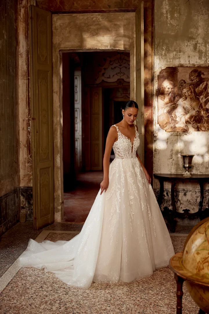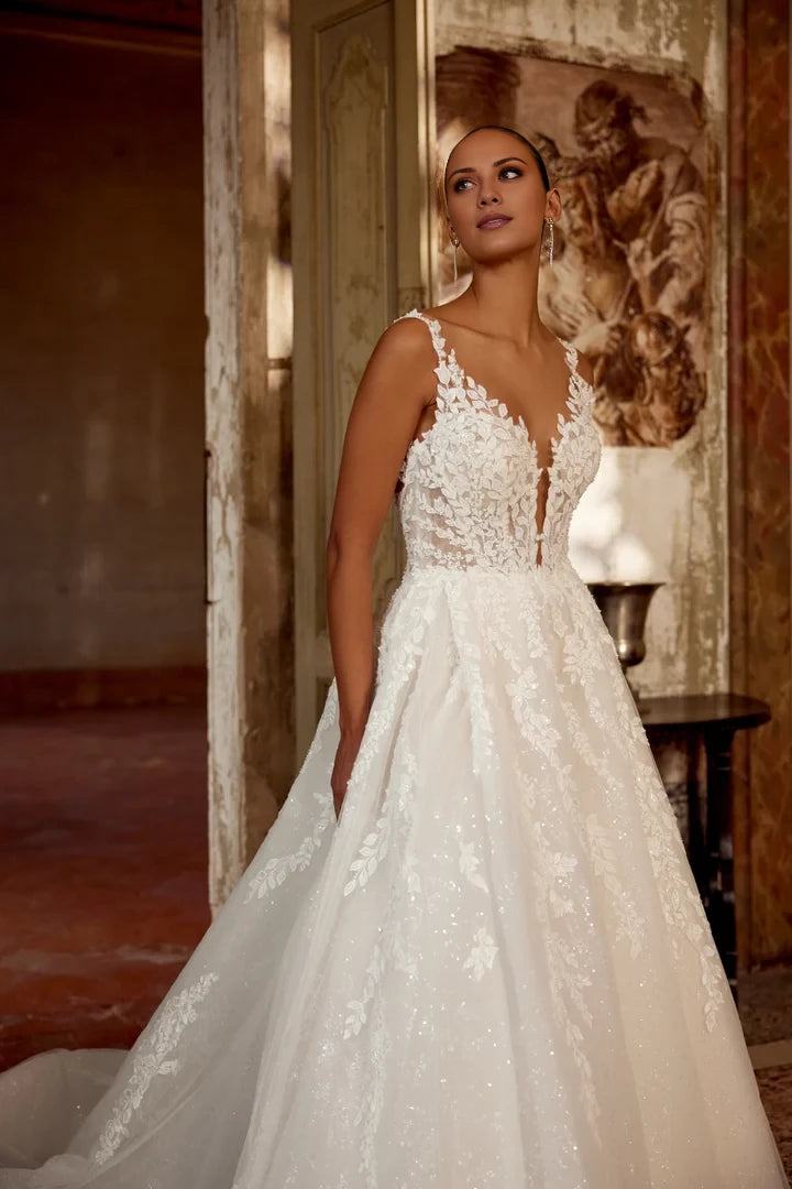 This wedding dress features a patterned glitter tulle ball gown design complemented by an illusion Sabrina neckline, combining elegance with a touch of sparkle for a sophisticated bridal look.