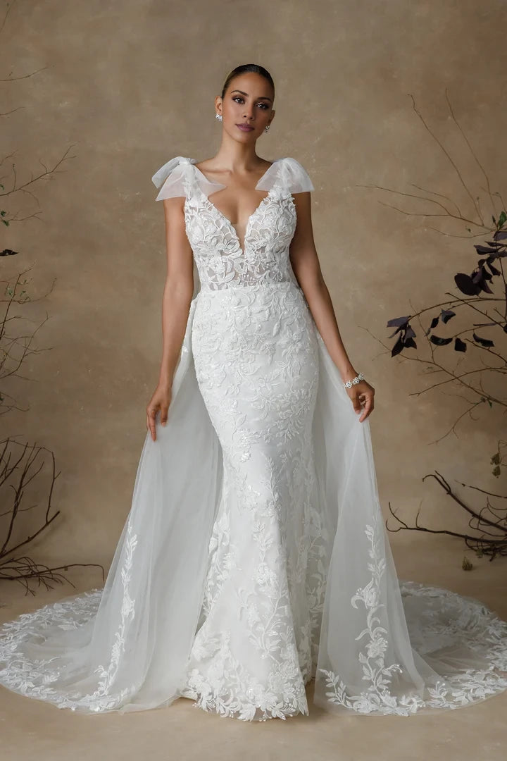 This wedding dress features a deep V-neckline adorned with intricate beadwork throughout, complemented by elegant shoulder bows for a sophisticated bridal look.