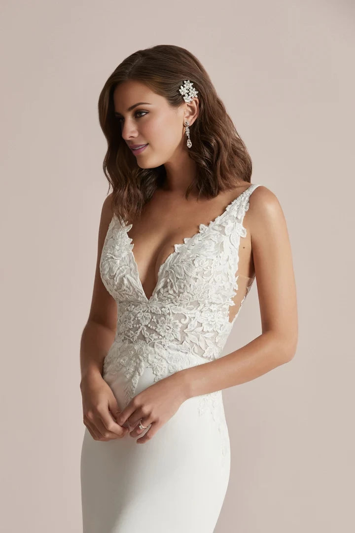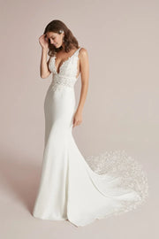 This wedding dress features a deep V-neckline and a fit-and-flare silhouette, complemented by an illusion train for an elegant and sophisticated bridal look.