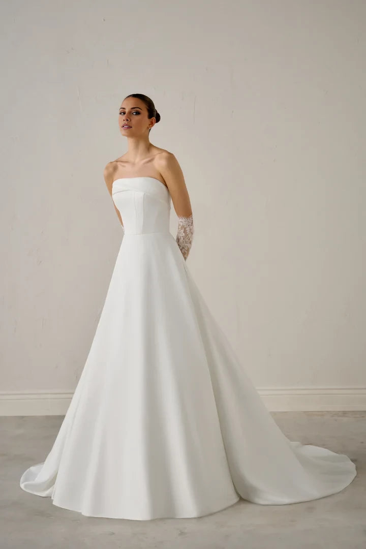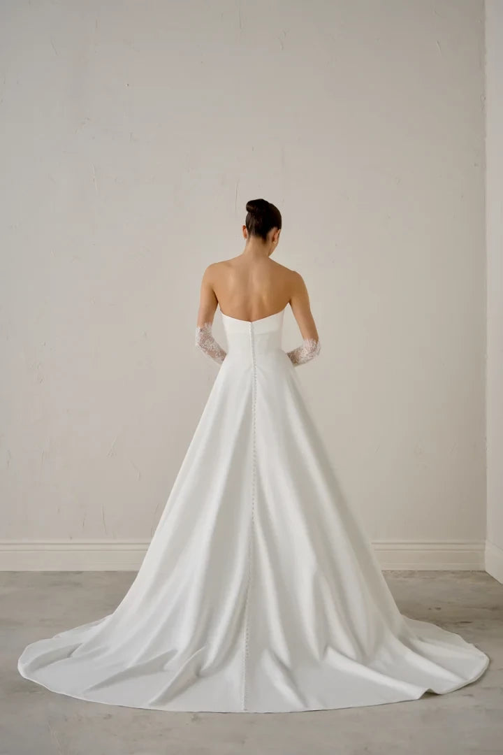 This wedding dress features a satin A-line silhouette with a strapless design and an asymmetrical cuff neckline, combining elegance with modern style.