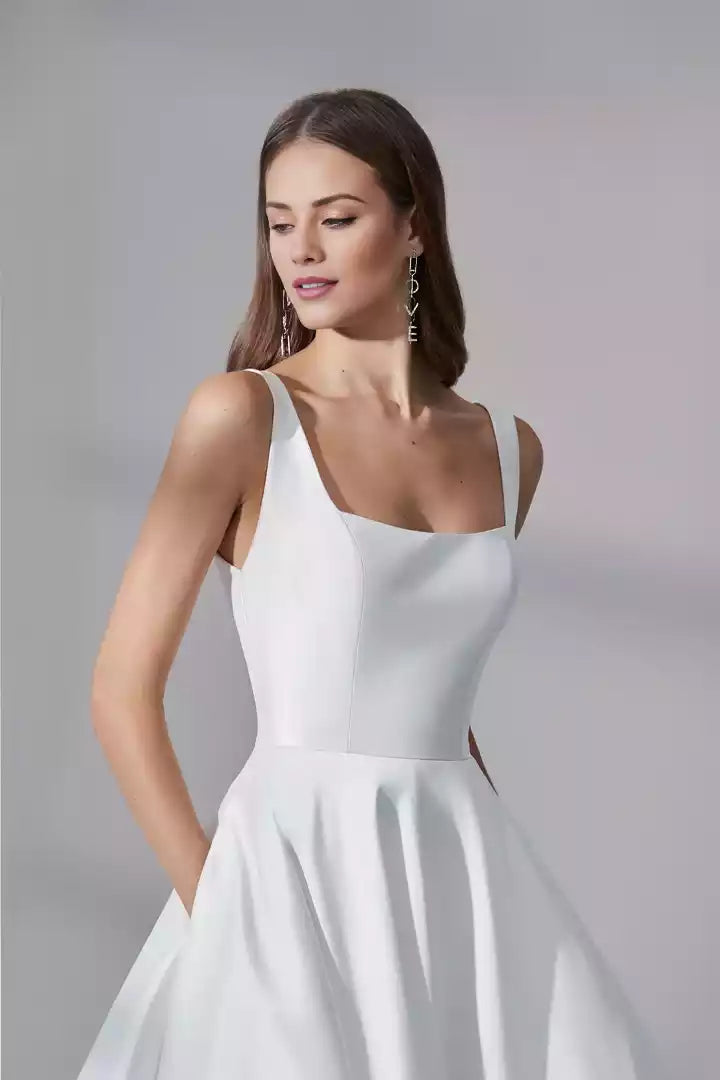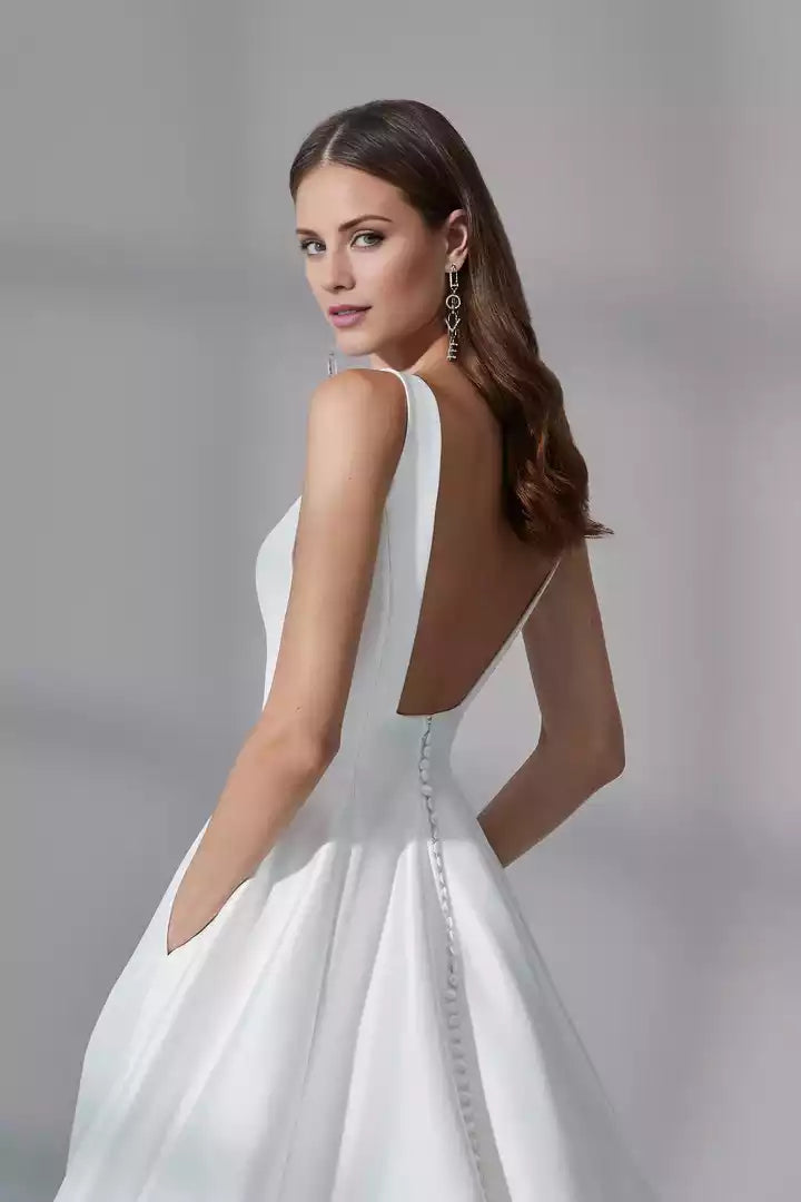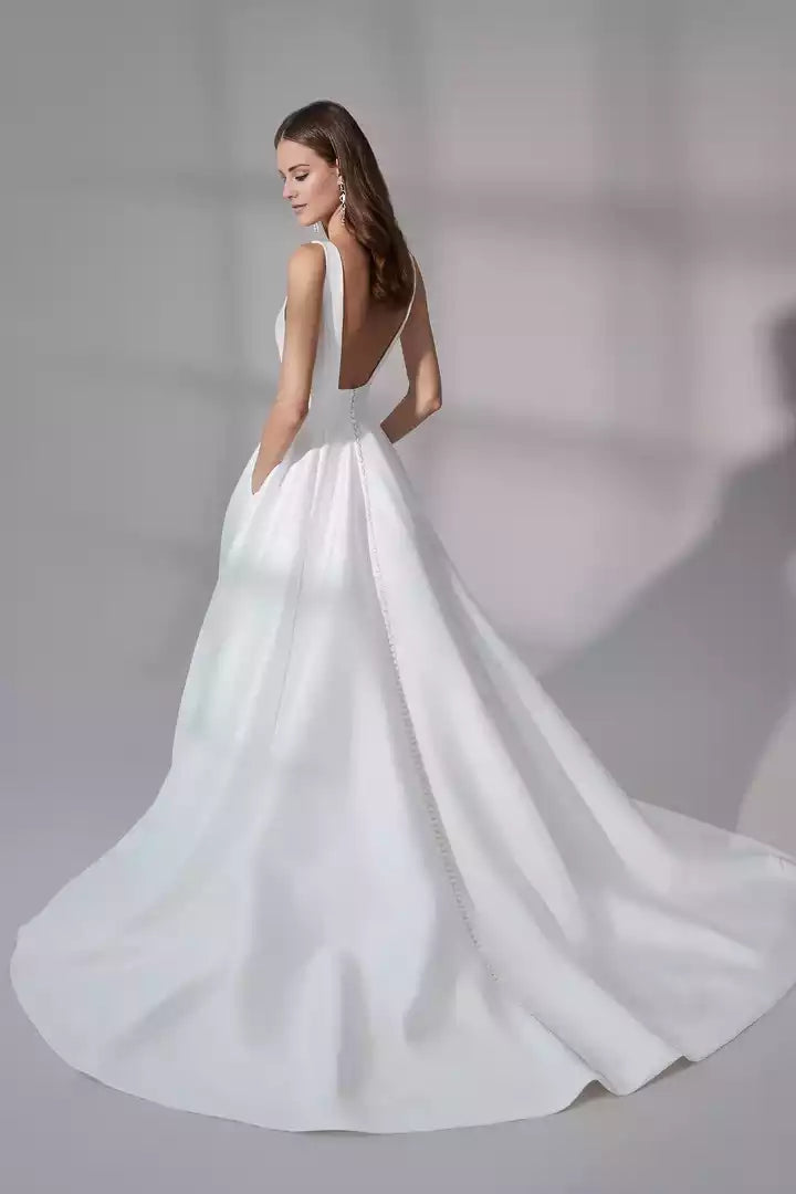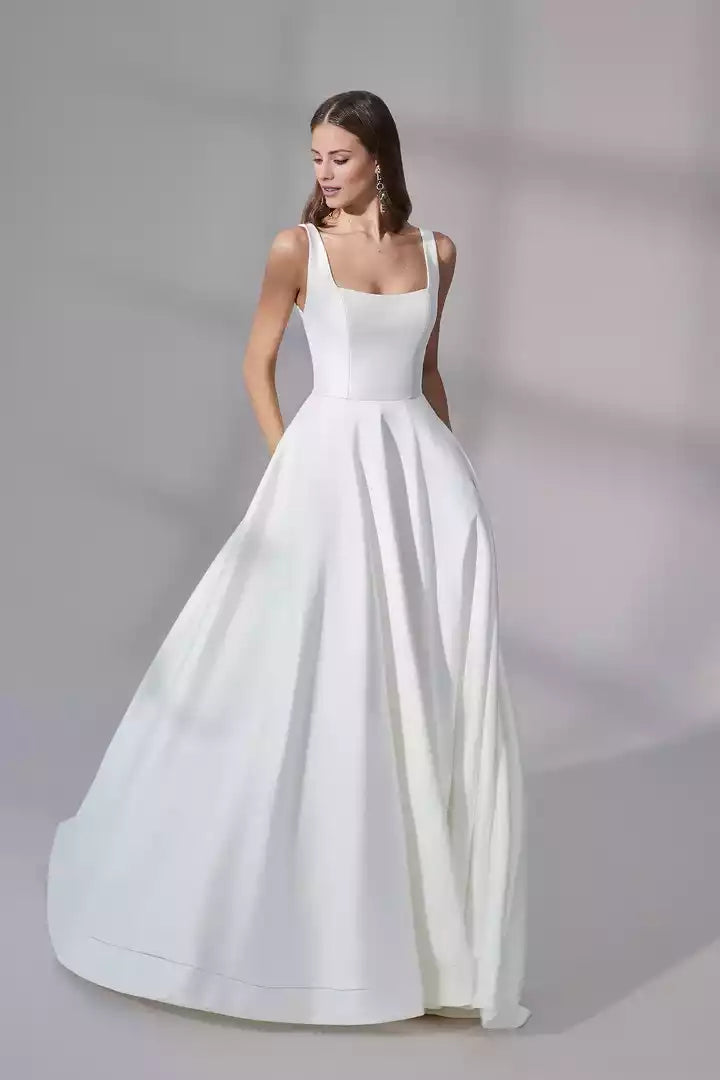 This elegant wedding dress features a satin fabric with a sleeveless design and a classic square neckline, crafted in a voluminous ball gown silhouette for a timeless bridal look.