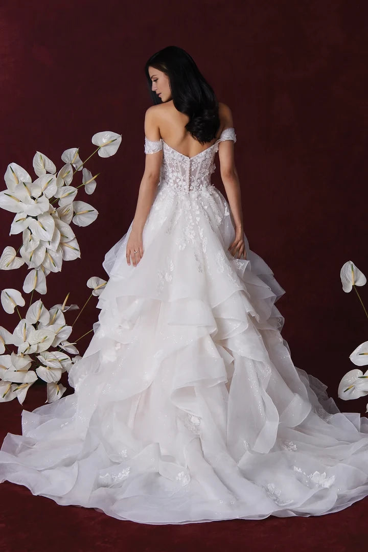 This wedding dress features a sheer bodice paired with a ball gown silhouette, highlighted by a ruffled tulle skirt adorned with sequins for an elegant and sophisticated look.