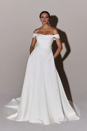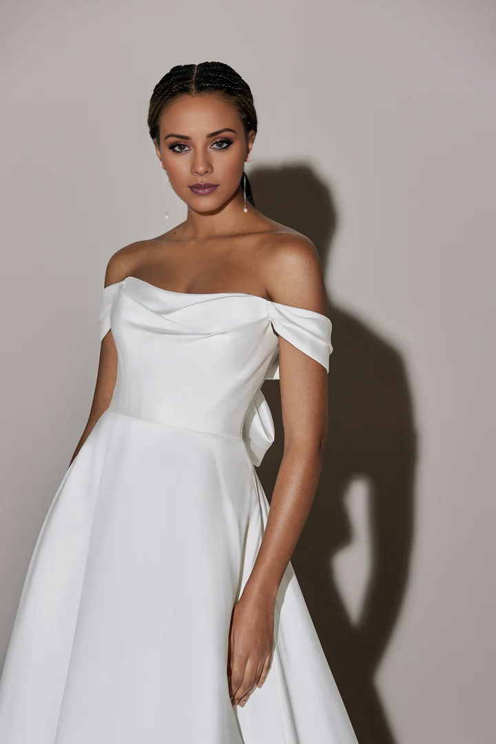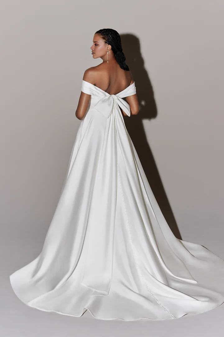 This elegant wedding dress features a silk A-line silhouette complemented by an off-the-shoulder neckline, combining classic style with a modern touch for a timeless bridal look.