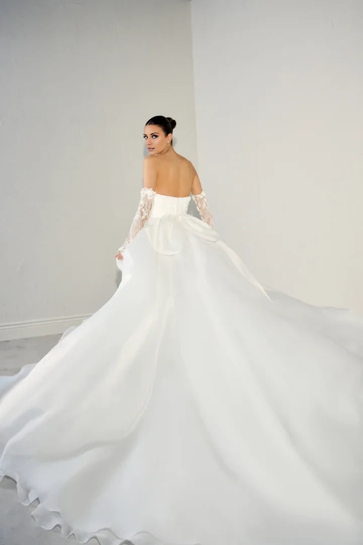 This dazzling fit and flare wedding gown features intricate 3D floral appliqués, creating a stunning and elegant silhouette perfect for your special day.