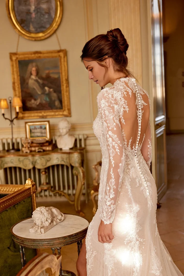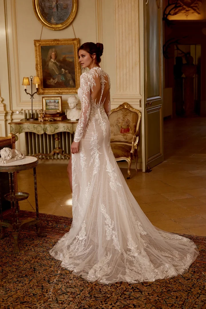 This elegant fit and flare wedding gown features a shimmering design, a jewel neckline, and a delicate illusion back, combining classic style with modern sophistication.