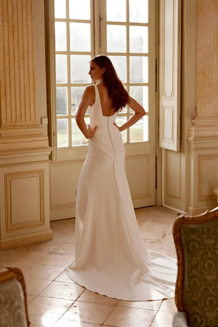 This wedding gown features a square neckline and a crepe fabric construction, designed in a fit-and-flare silhouette with elegant ruching details.