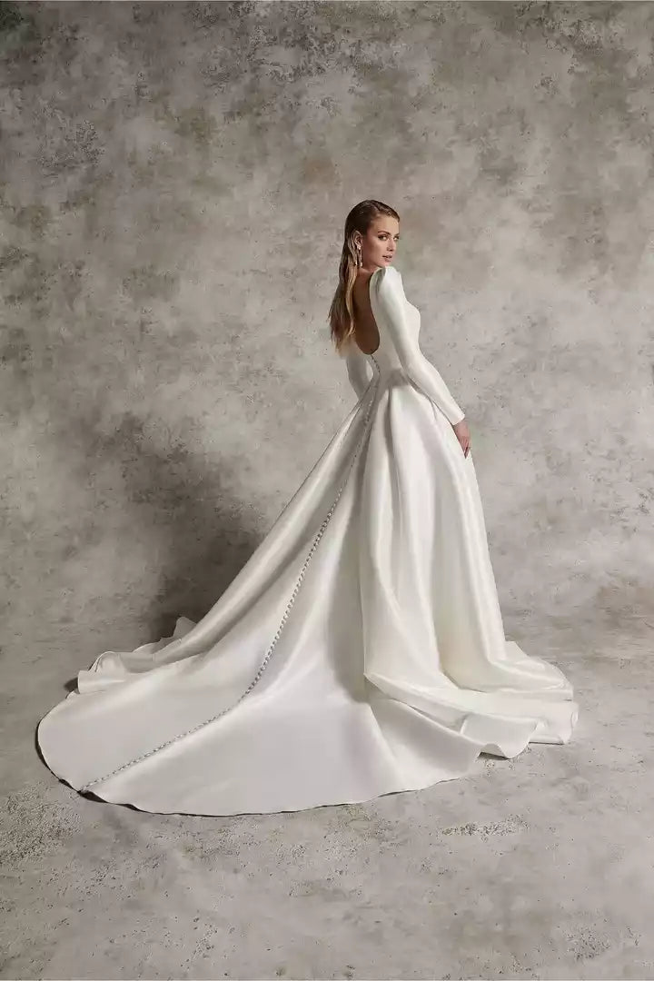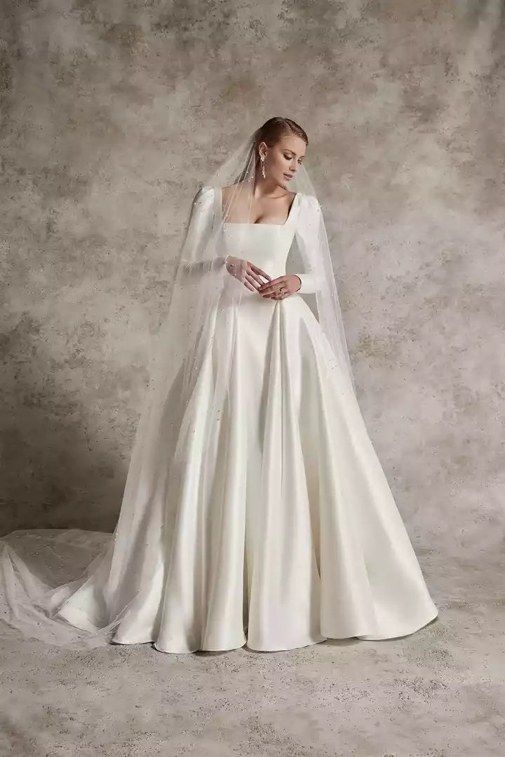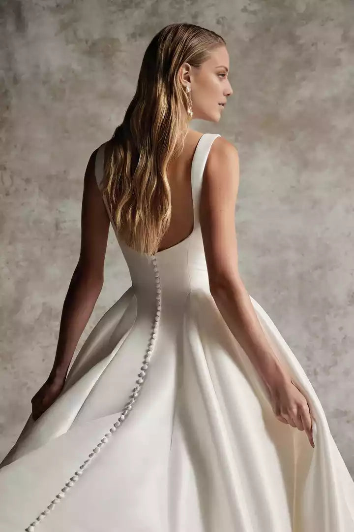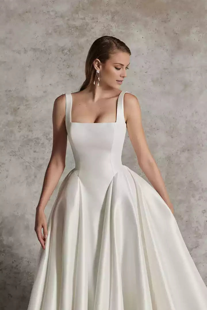This wedding dress features a square neckline and a ball gown silhouette, enhanced by precise couture seaming for an elegant and structured fit.