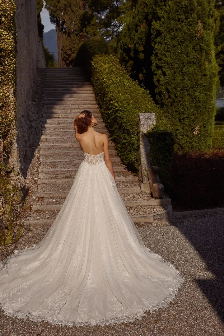 This wedding dress features a strapless ball gown silhouette complemented by a scoop neckline and an elegant Chantilly lace underlay, combining classic design with intricate detailing.