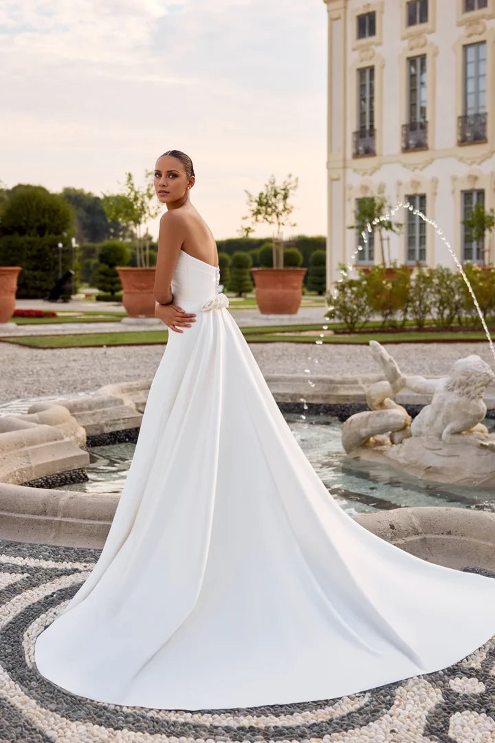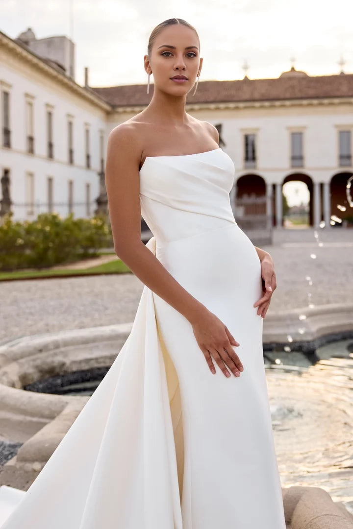This strapless fit-and-flare wedding gown features elegant draping across the bodice, creating a sophisticated silhouette perfect for your special day.