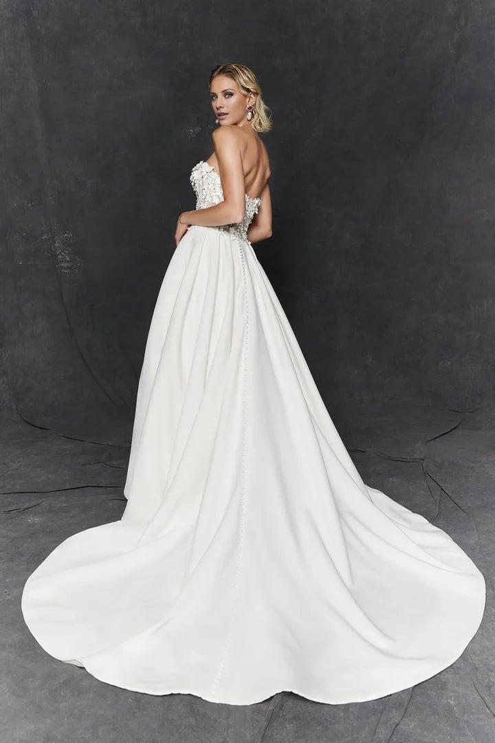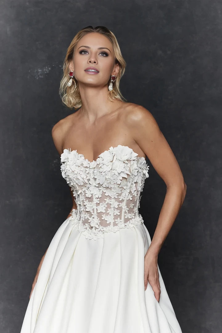 This elegant wedding dress features a strapless satin ball gown silhouette, highlighted by a basque waist and adorned with intricate 3D floral details for a sophisticated bridal look.