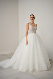 This wedding dress features a tulle ball gown silhouette paired with an intricately detailed sheer bodice adorned with crystal embroidery, creating an elegant and sophisticated bridal look.