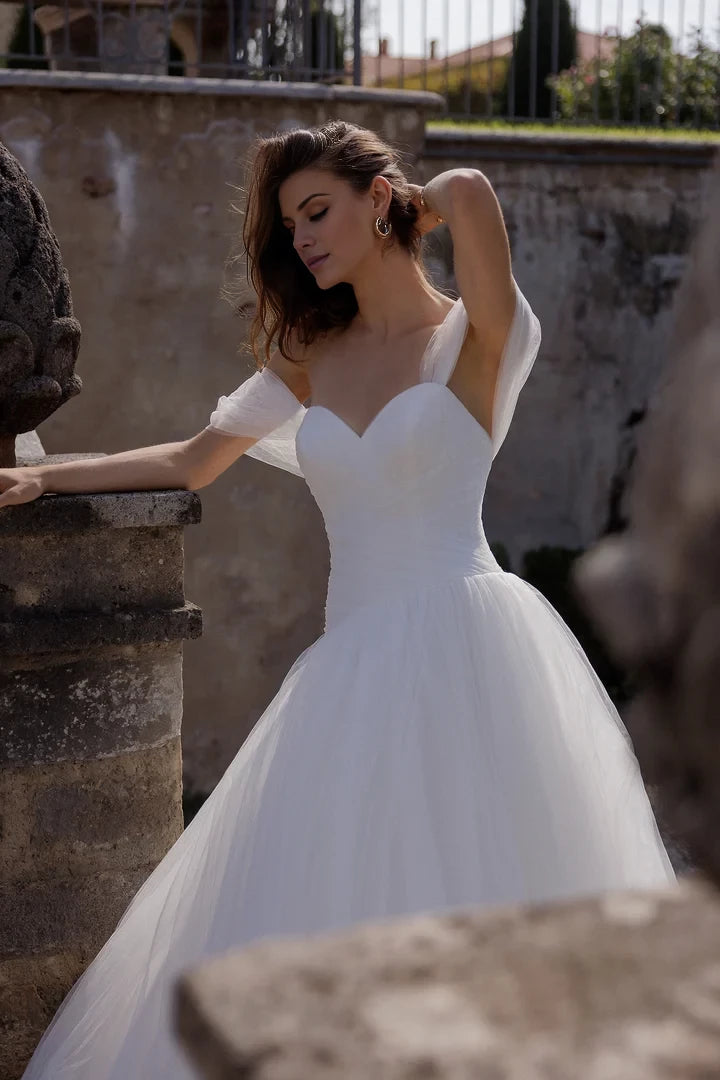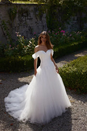 This wedding dress features a tulle ball gown silhouette complemented by a ruched bodice and a dropped asymmetric waistline, creating an elegant and sophisticated look.