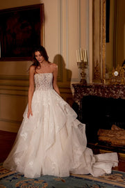 This wedding dress features a strapless neckline paired with an illusion bodice, crafted in delicate tulle to create a classic ballgown silhouette.