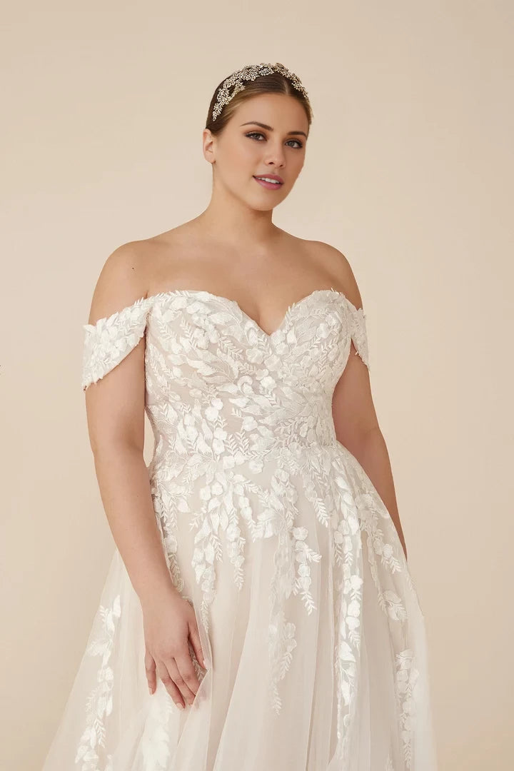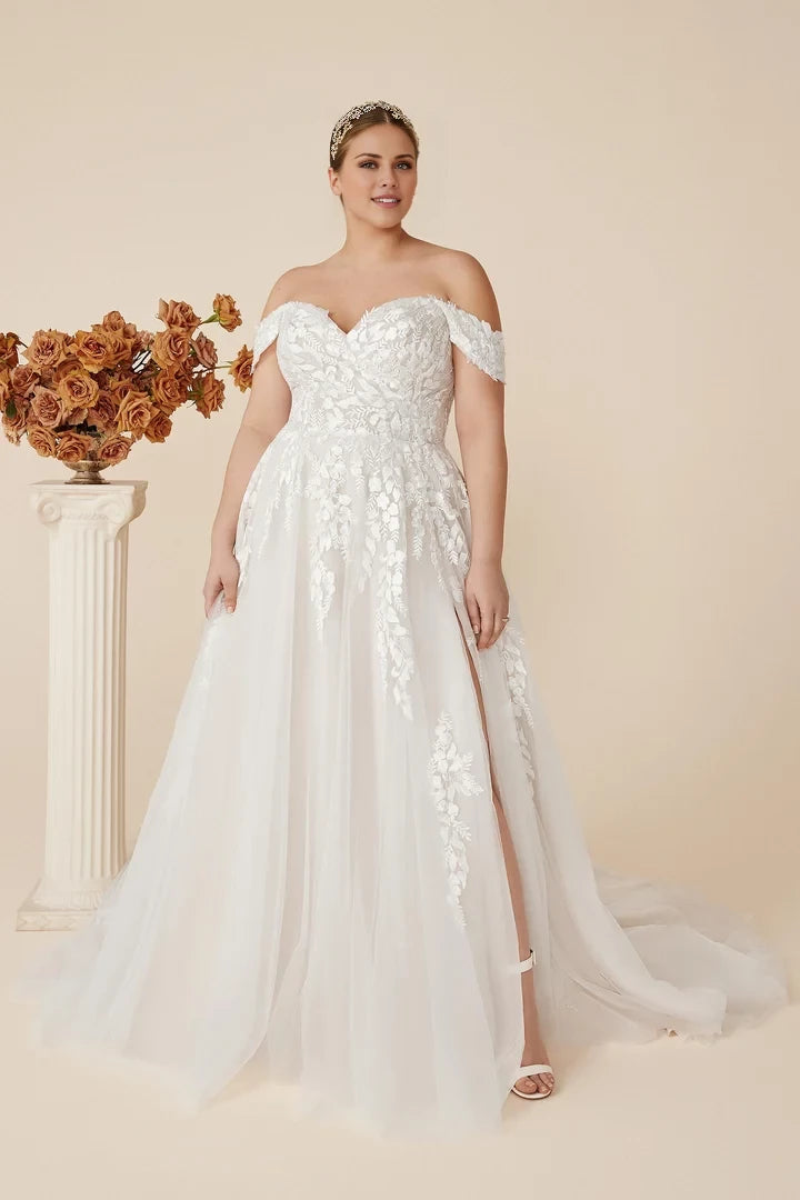 This elegant plus-size A-line gown features delicate tulle fabric and off-the-shoulder straps that can be detached for versatile styling, making it an ideal choice for wedding celebrations.