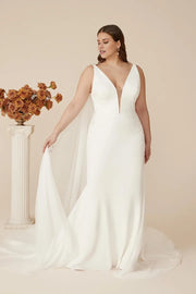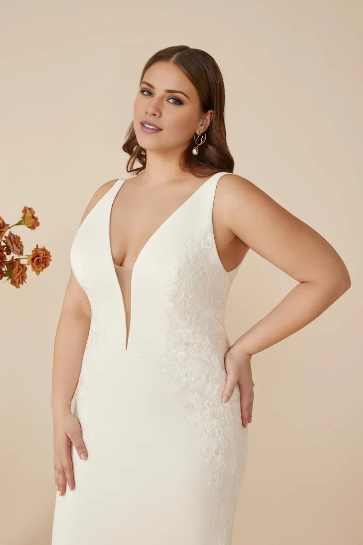 This plus-size wedding gown features a deep V-neckline and a fit-and-flare silhouette crafted from crepe fabric, designed to enhance and flatter your figure on your special day.